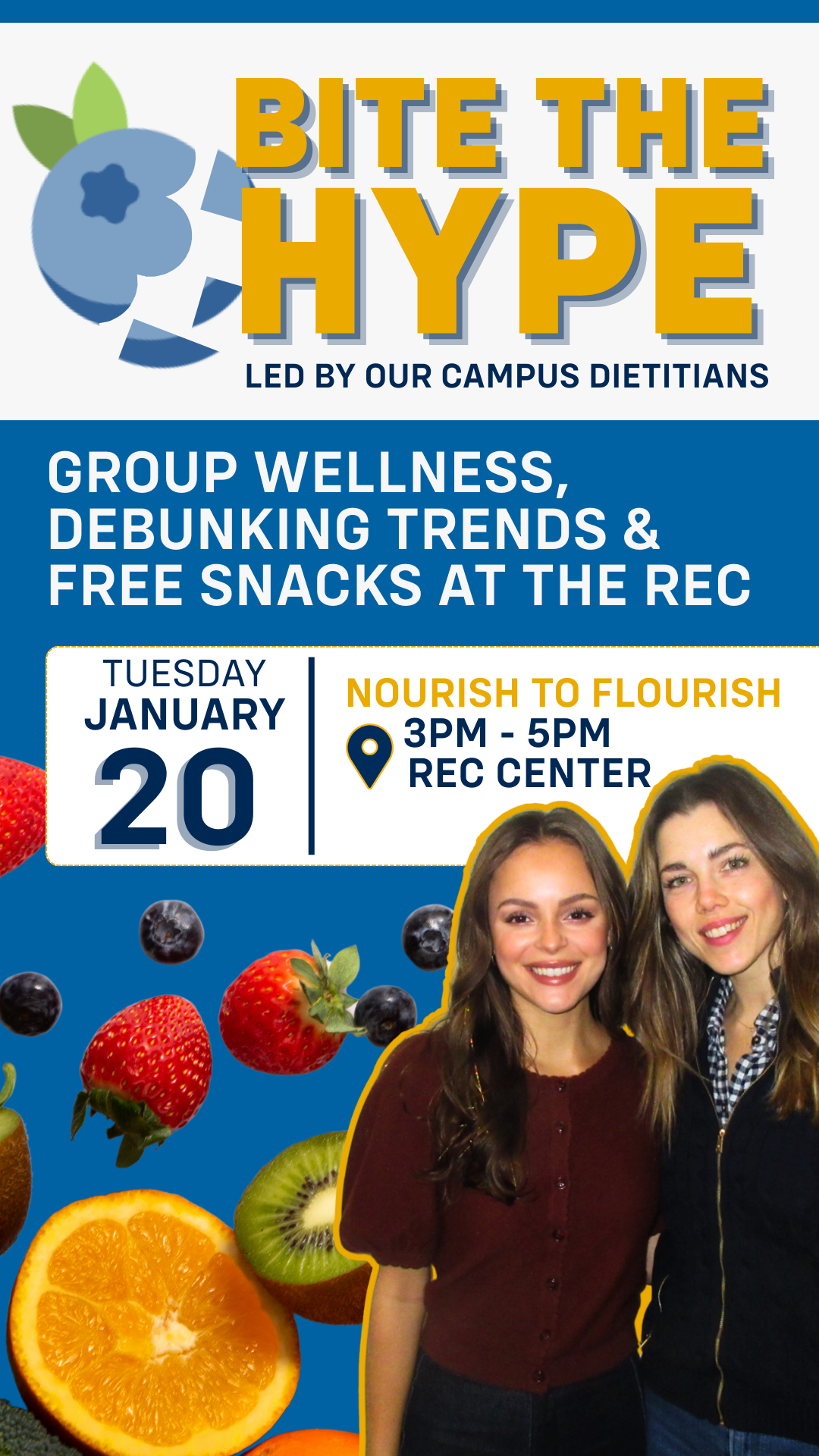 Cut through the wellness noise and get to what actually works. Bite the Hype is a fun, interactive group wellness session where students connect, snack, and learn real wellness facts from our campus dietitians—no trends, no gimmicks, just practical tips to help you thrive.